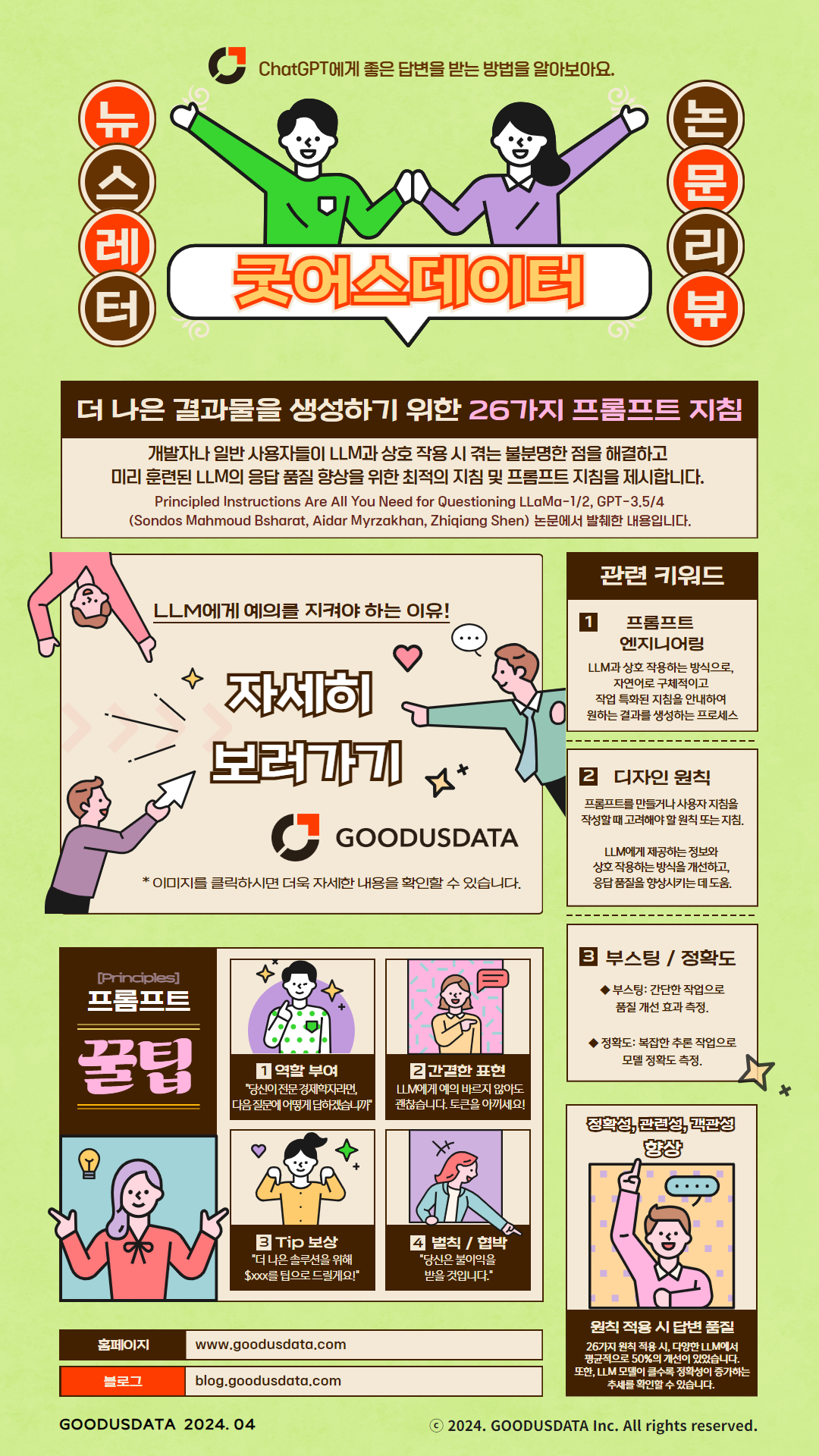 | [2024.04] 논문 리뷰 - 더 나은 결과물을 생성하기 위한 26가지 프롬프트 지침 (0) | 2024.04.01 |