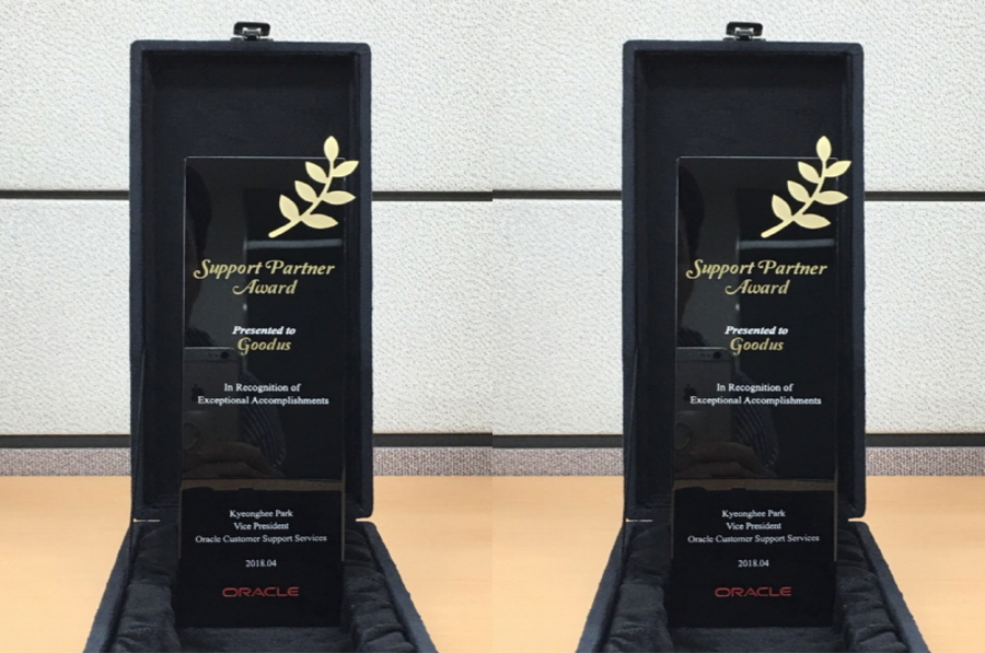 지난 4월 5일 저희 굿어스데이터의 대표적인 파트너이자 글로벌 벤더인 Oracle로부터 "Oracle FY18 Support Partner Award"를 수상하였습니다.