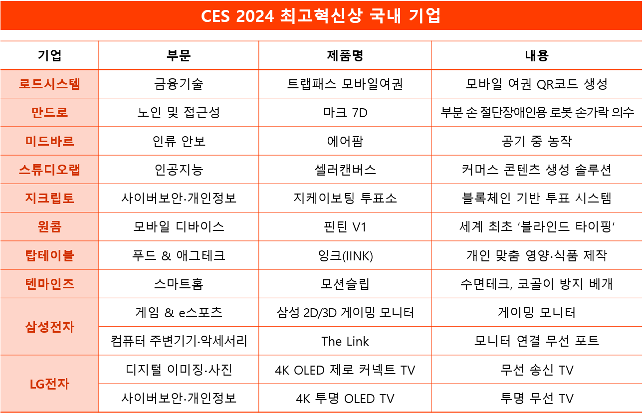 CTA가 매년 혁신적인 제품 및 서비스를 평가해 수상하는 ‘CES 최고혁신상’은 수상 제품 및 기술 특징을 바탕으로
