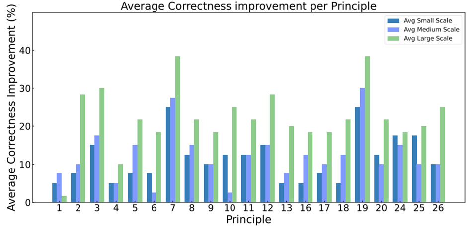 - 제안된 원칙이 적용된 일련의 질문에서 응답 품질의 향상도를 백분율로 표시.