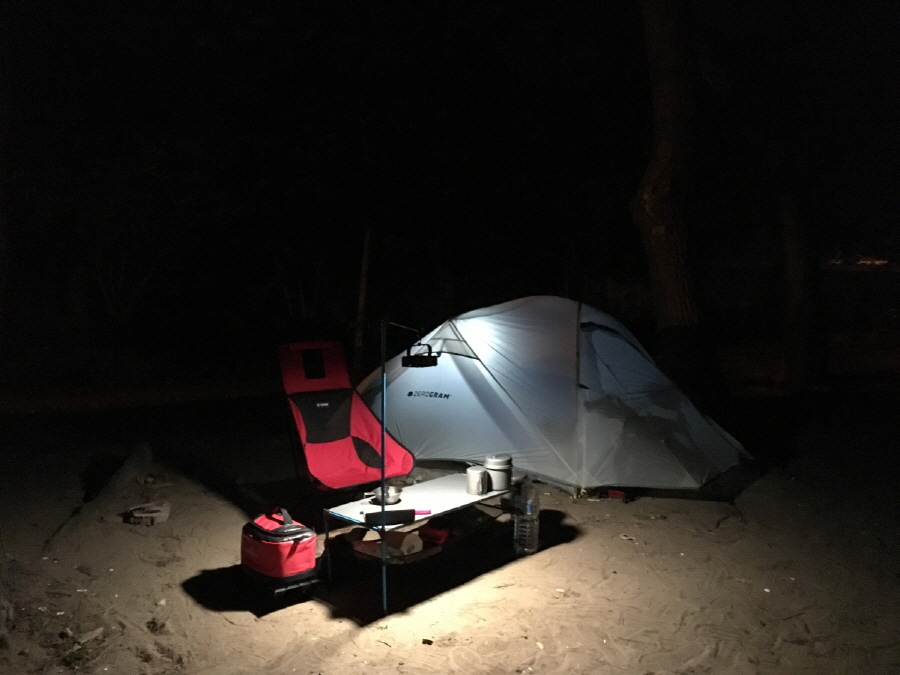 해가 지고 빠른 밤이 찾아왔습니다. 그리고 텐트 속 랜턴을 밝혔습니다.