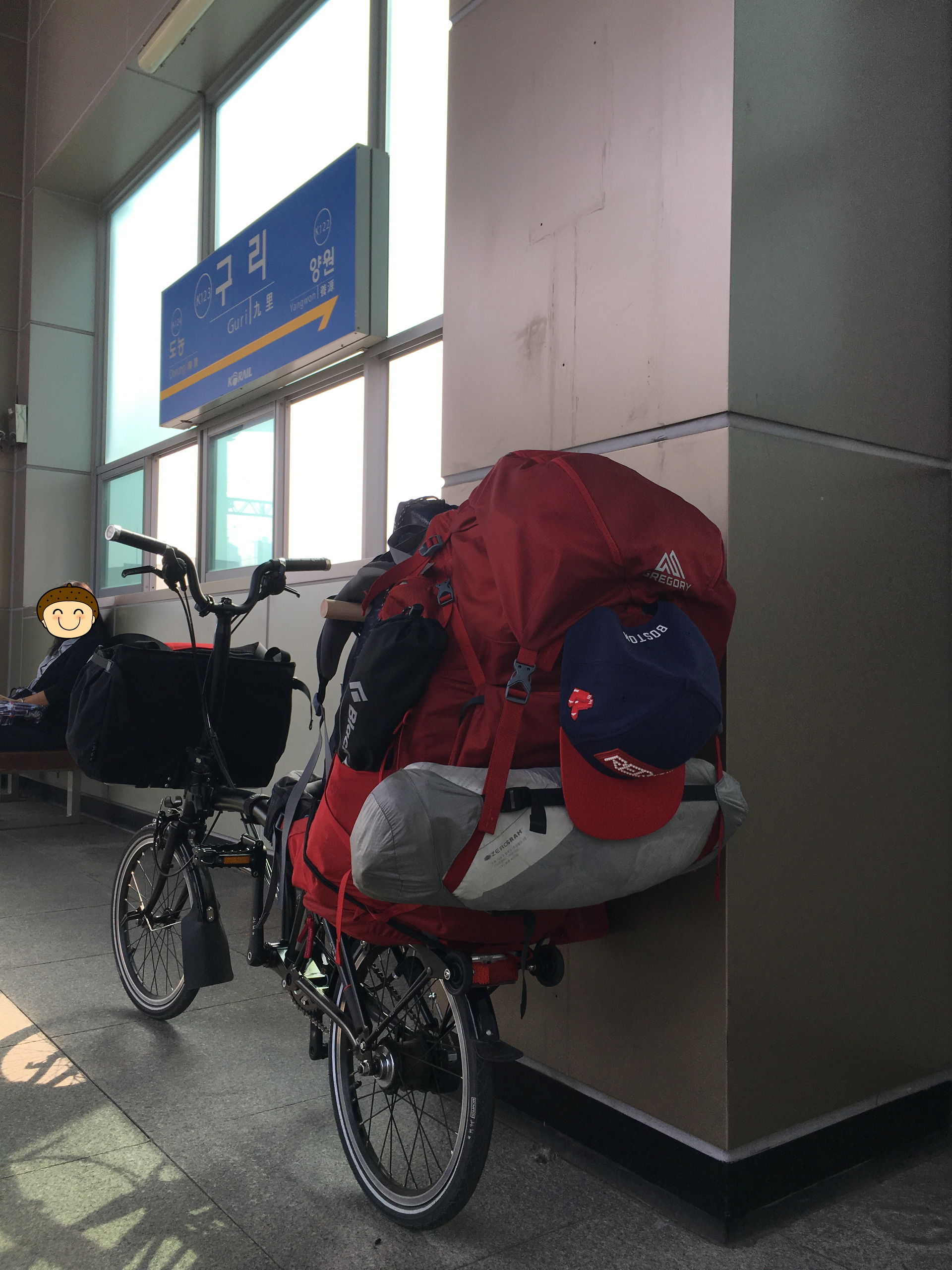 짐받이 칸에 실린 백팩에는 침낭, 매트, 텐트, 망치, 스틱.. 이것저것 열심히 챙겨 넣었습니다.(총 20kg)