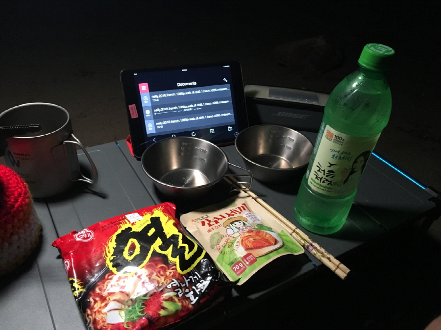 도착하자마자 재빨리 의자와 테이블, 텐트를 설치하고 허기진 배를 달래기 위해 공수해온 아이템을 꺼냅니다!!
