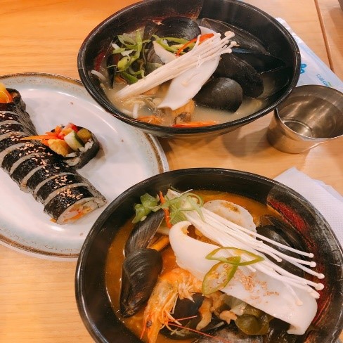 라면에 각종 해산물이 들어가있는 라면(매운맛,순한맛)과 산삼김밥입니다.