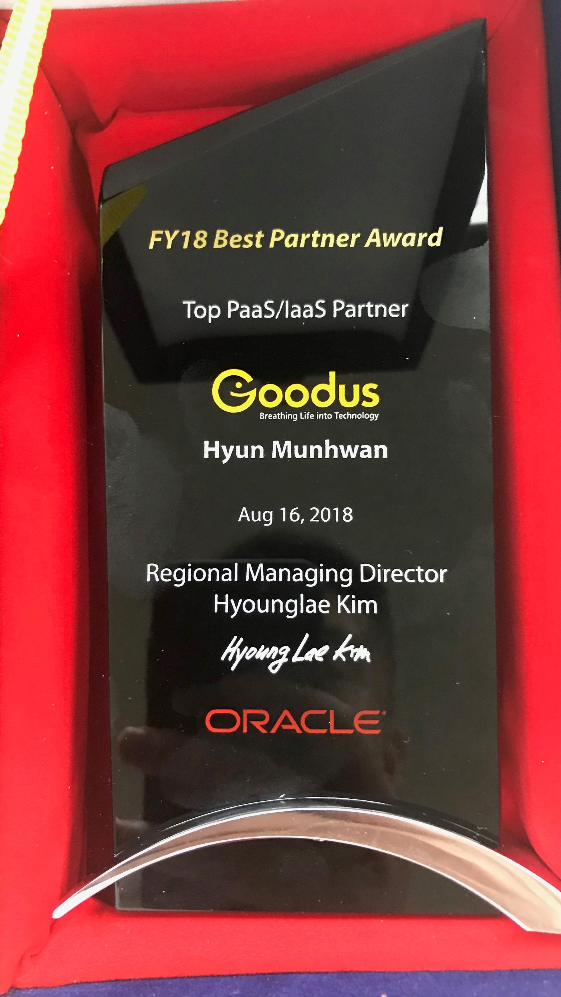마지막으로 FY18 Best Partner Award가 있었는데, 굿어스데이터는 Cloud PaaS, IaaS Sales 부문에 현문환 영업대표가 수상하였습니다.