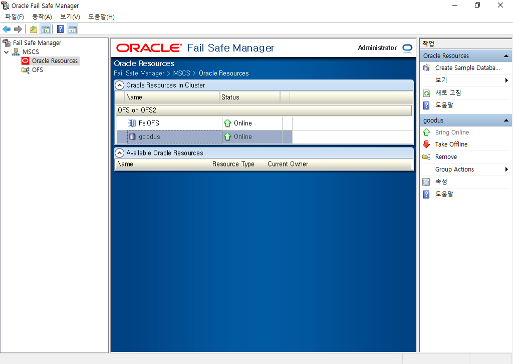 Oracle Fail Safe(OFS)는 Microsoft Windows Failover Cluster(이전의 Microsoft Cluster Server MSCS)와 함께 작동하여 사용자에게 고가용성(High Availability) 서비스를 더 쉽고 유연하게 제공해주는 Oracle Solution으로 두 개 이상의 Microsoft Windows System을 구성하여 Active 상태의 Node에 계획되지 않은 중단 및 장애가 발생하면 신속한 Failover 및 Restart 기보안 능을 지원합니다.