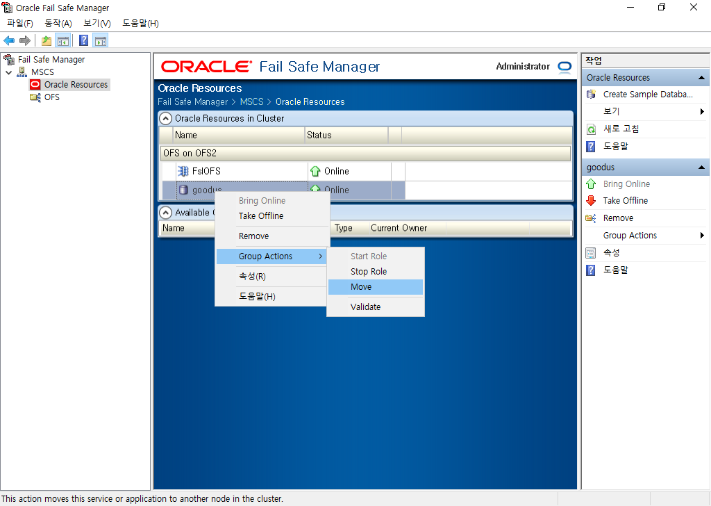 l Failover Cluster Manager를 사용하여 Cluster Group의 위치를 보거나 변경할 수 있습니다. Oracle Fail Safe Server가 설치되지 않은 Node로 Cluster Group을 이동하면 Oracle Fail Safe Server가 제대로 작동하지 않습니다.
