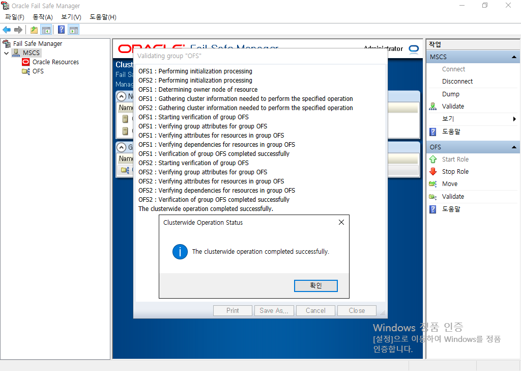 l Microsoft Windows Failover Cluster Manager의 동작 메뉴에 있는 Cluster Validate 를 선택하고 Validation Report 를 확인하여 유효성을 검토해야 합니다. Oracle Fail Safe Server를 설치하기 전에 반드시 Failover Cluster Validate Check 중에 발생한 모든 문제를 해결하는 것을 권고합니다.